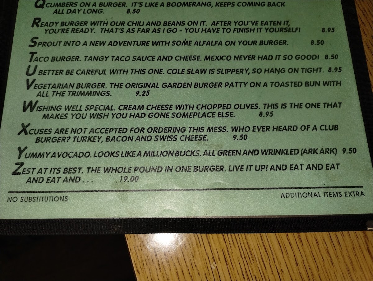 The burger lineup is a defining feature, presented with a playful A to Z format that adds a touch of fun without complicating choices. You’ll find options ranging from the timeless classic burger to more unique combinations, all crafted to pair perfectly with crispy, fresh-cut fries available in several portion sizes. Breakfast items and other comforting staples complement the burgers, rounding out a menu that feels familiar and easygoing.